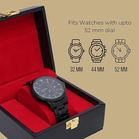 Showcase and protect your favorite timepiece with this luxury watch box for men, crafted with a premium black faux leather exterior and a rich red velvet interior. Designed for elegance and function, this single watch display case is perfect for safe storage, travel, or gifting. The soft velvet cushion cradles your watch to prevent scratches and maintain its shape, while the gold-tone metal lock ensures secure closure. Its compact size makes it a travel-friendly watch organizer, ideal for carrying your favorite watch wherever you go. Whether you’re gifting for birthdays, anniversaries, Father?s Day, or special occasions, this watch gift box adds a premium touch to any presentation. Suitable for luxury watches, smartwatches, and classic timepieces.