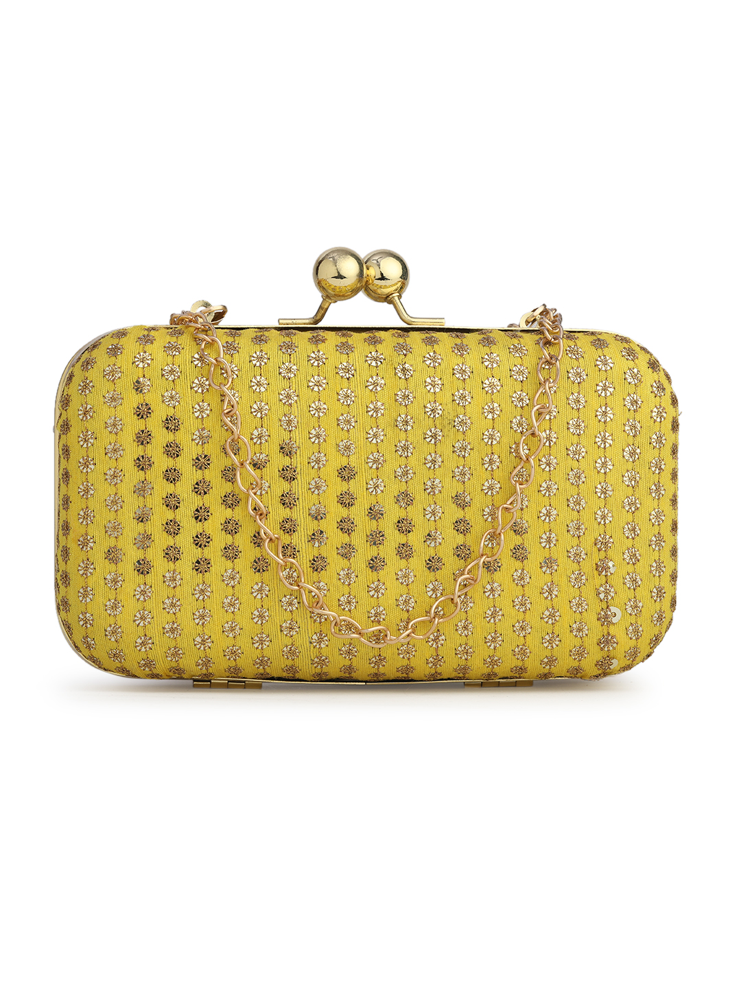 Yellow & Gold Embroidered Box clutches, Has gold chain shoulder strap, 1 main compartment with Kiss closure